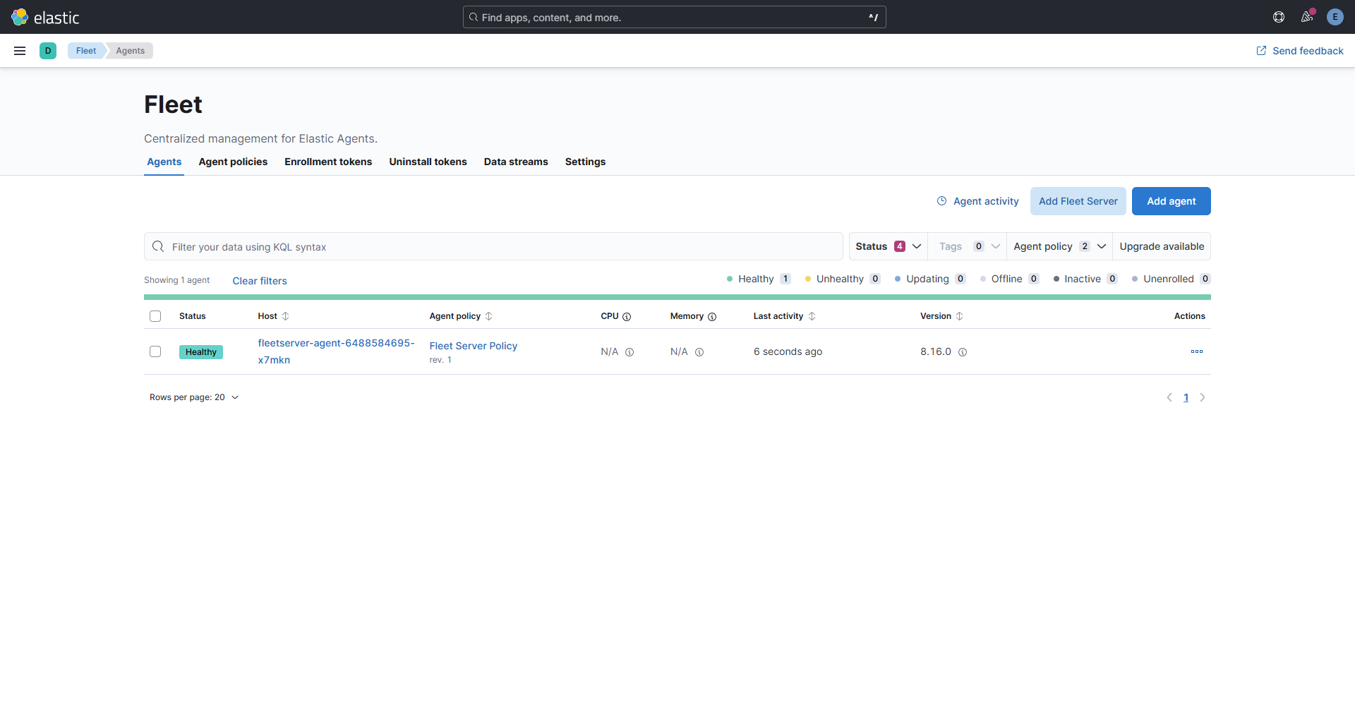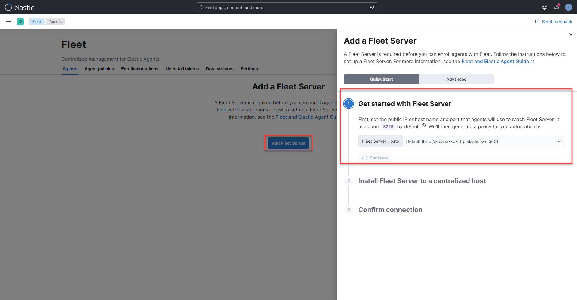 Generating the default Fleet Policy – Navigating to the fleet page from the left hand side bar, select add Fleet Server. Select Continue under step 1 to create the default agent policy. The agents applied through the Kubernetes YAML file will then be able to sync up to the default policy. Including the internal agent that handles Fleet Server’s own communication telemetry, and management tasks. If desired later on, the agents can then be moved to a different policy later on in the UI, but require the default policy to connect without extra cli configuration. Close the Add a Fleet Server wizard window and wait a couple of minutes for the agent to come online.
