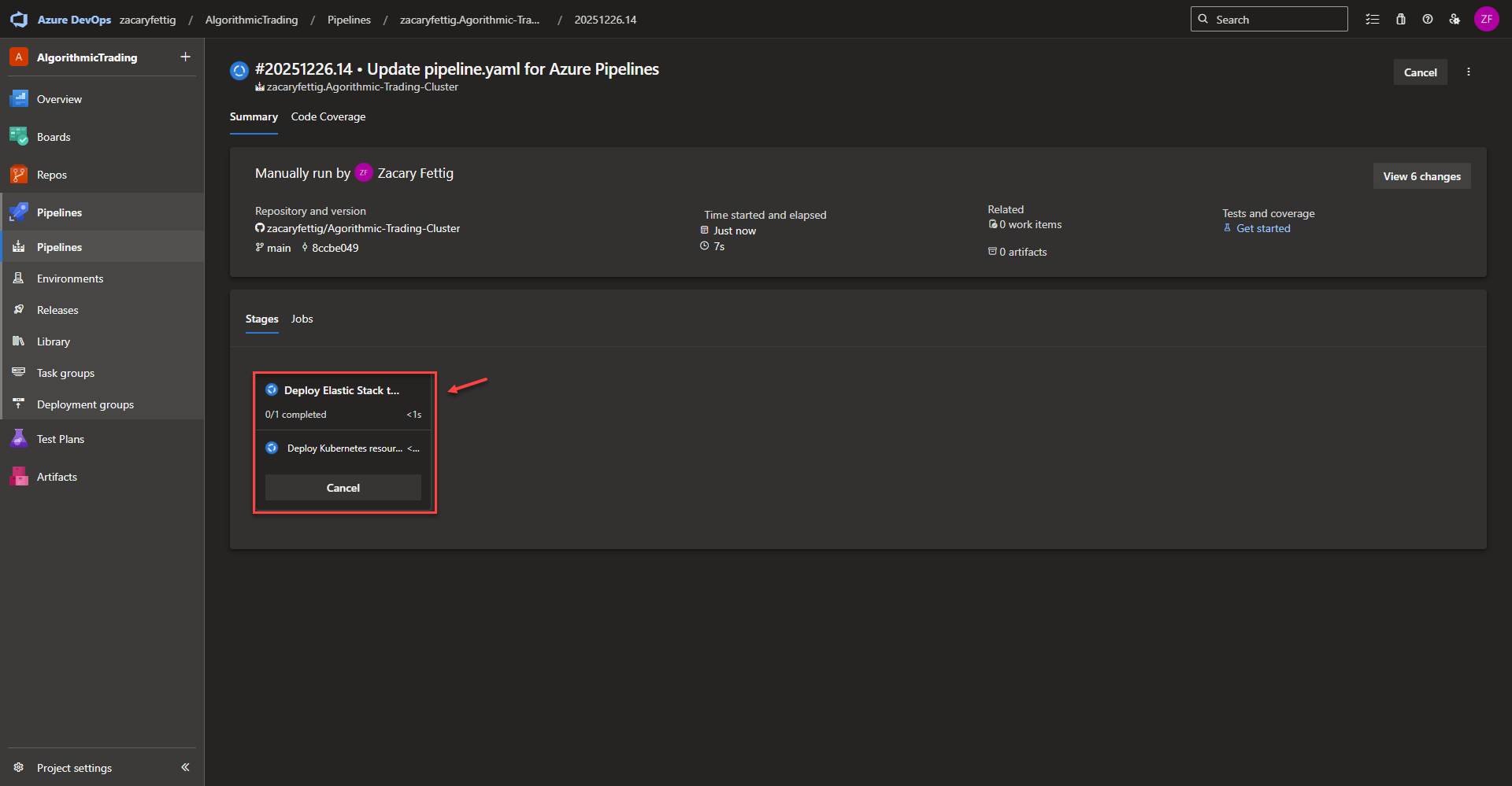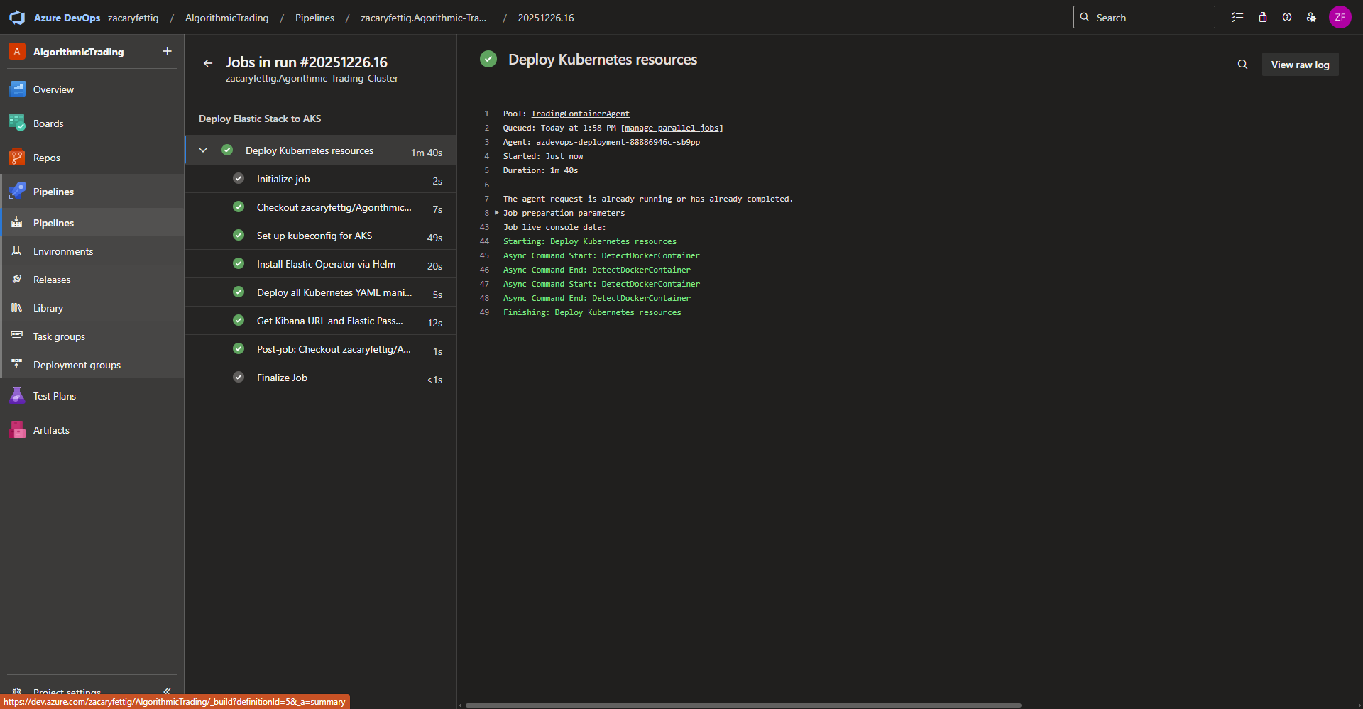 Azure Completing Jobs – The pipeline will run through all of the jobs and show a green check mark upon successful completion. It will notify and show the logs of any errors that cause the pipeline to fail which can directly be used for troubleshooting. Once this runs successfully, all of the required resources for monitoring the cluster with Elastic will have been deployed.